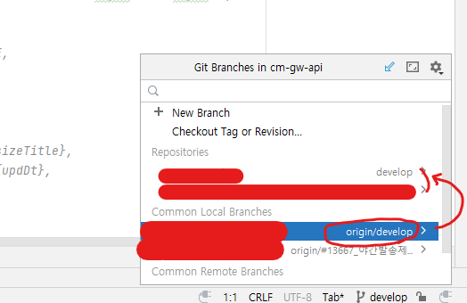 - “common local branches” 가 나타나면 repositories 를 각각 선택하지 않고, common local branches 중 하나를 선택하면 여러개의 프로젝트가 같은 이름으로 모두 switch 된다.